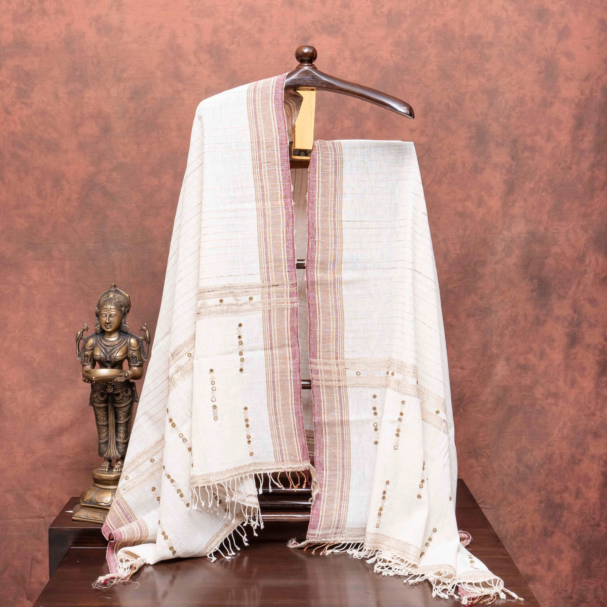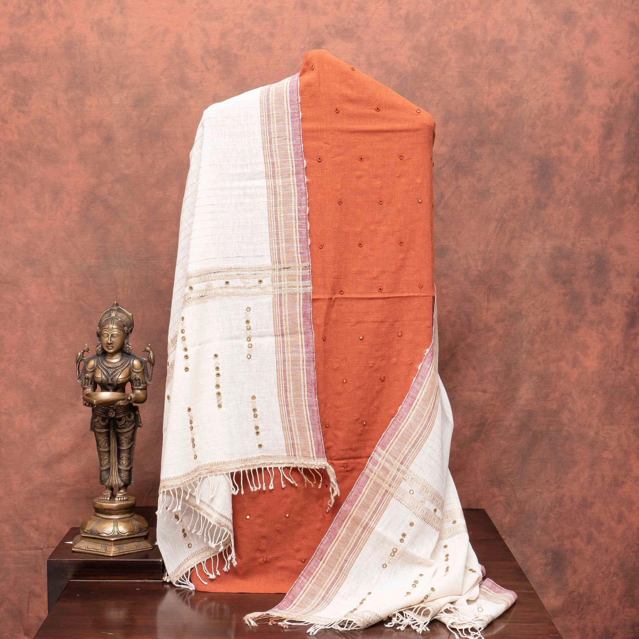 Color: A rich, earthy rust color for the cotton base, accented by the subtle shimmer of the mirror work on light beige dupatta.