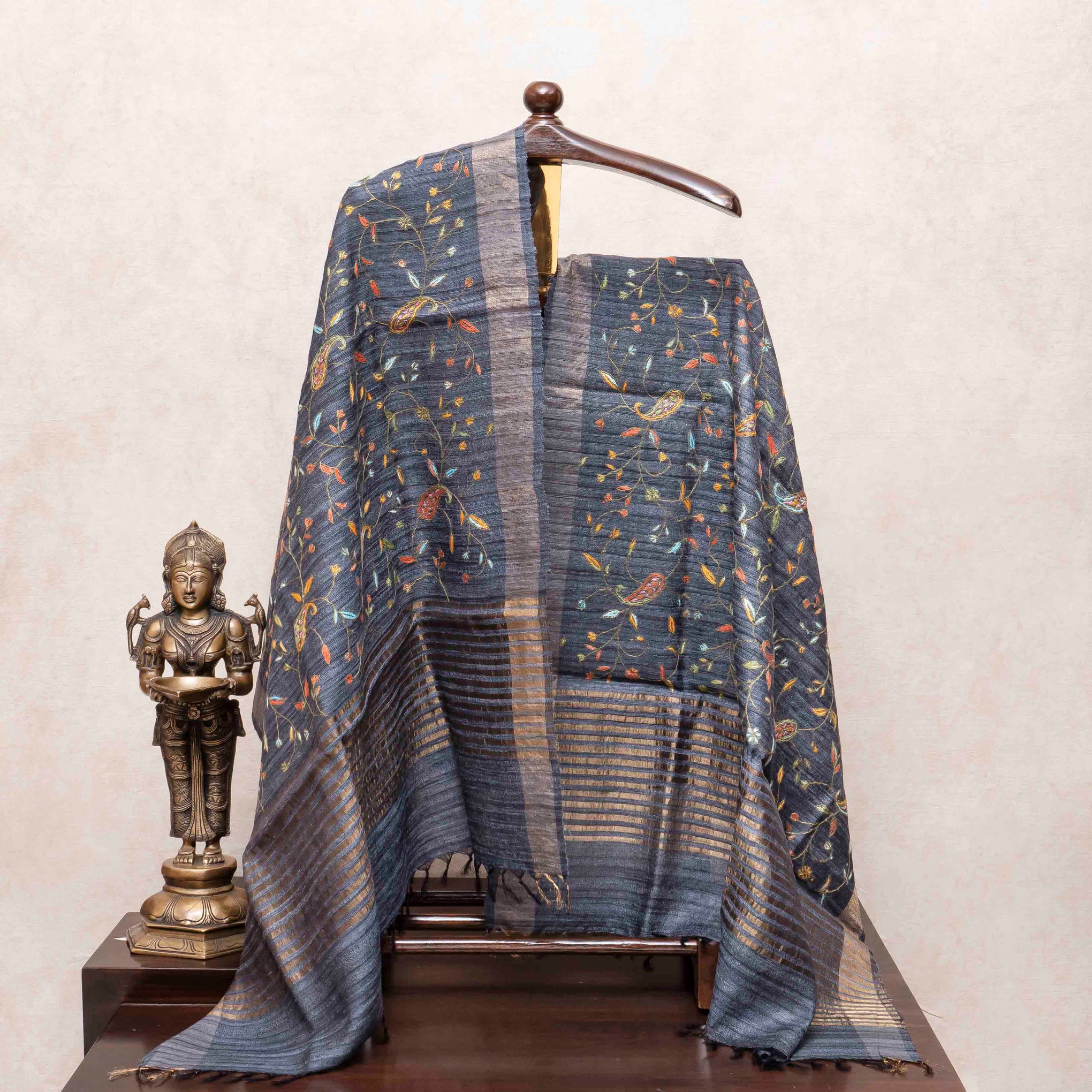 Product Details: This opulent ensemble features a Handloom Ikkat raw silk kurta fabric, a generous 2.5-meter piece with a natural sheen and subtle diamond patterns. The set is beautifully complemented by a Handloom Tussar silk dupatta, which serves as a canvas for exquisite Kashmiri hand embroidery. This unique pairing is a magnificent blend of two distinct Indian textile arts, perfect for a refined and unforgettable look.