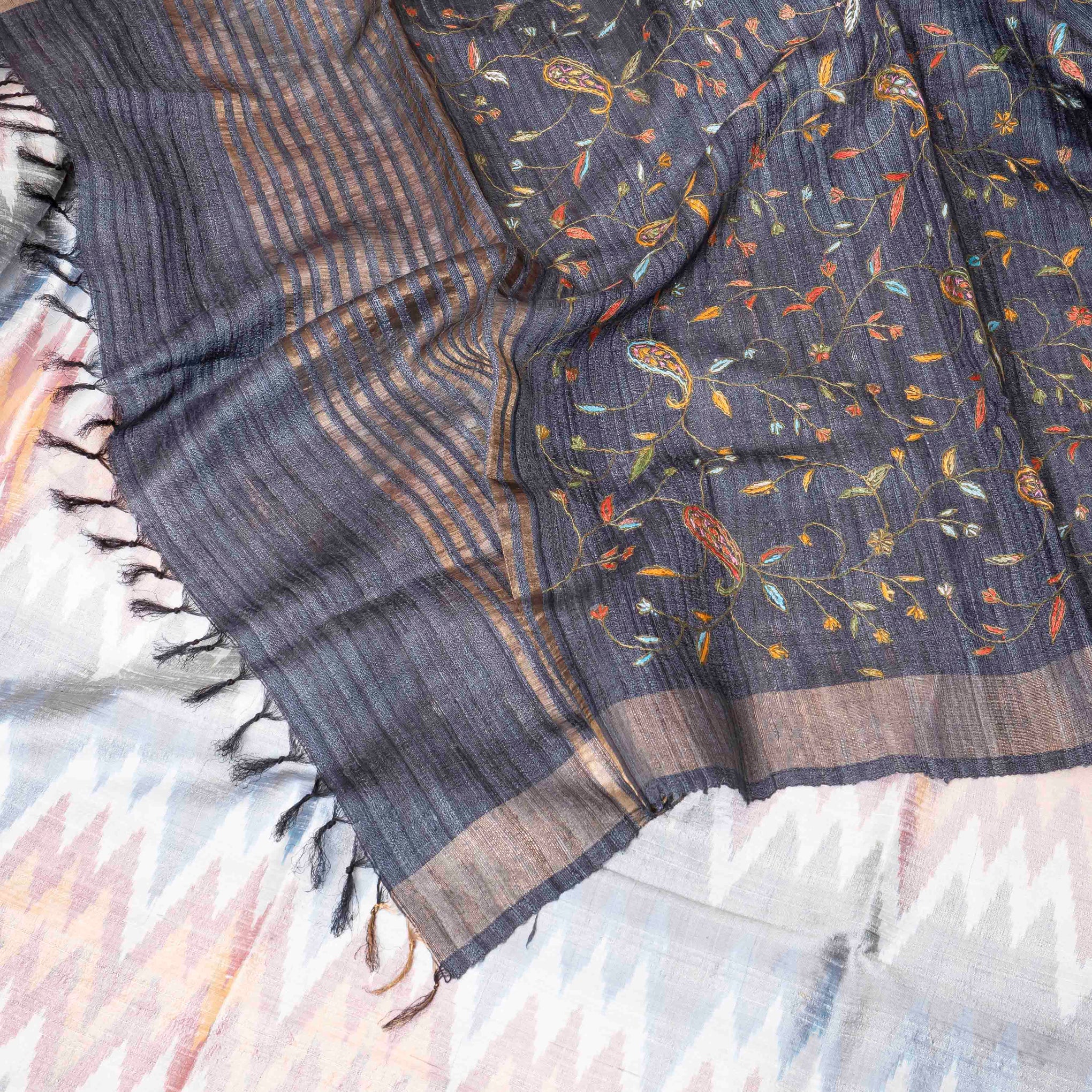 Color: A dark, sophisticated grey-red kurta with jewel-toned Ikkat dots, brilliantly accented by a vibrant, multicolored Kashmiri embroidered on grey dupatta.