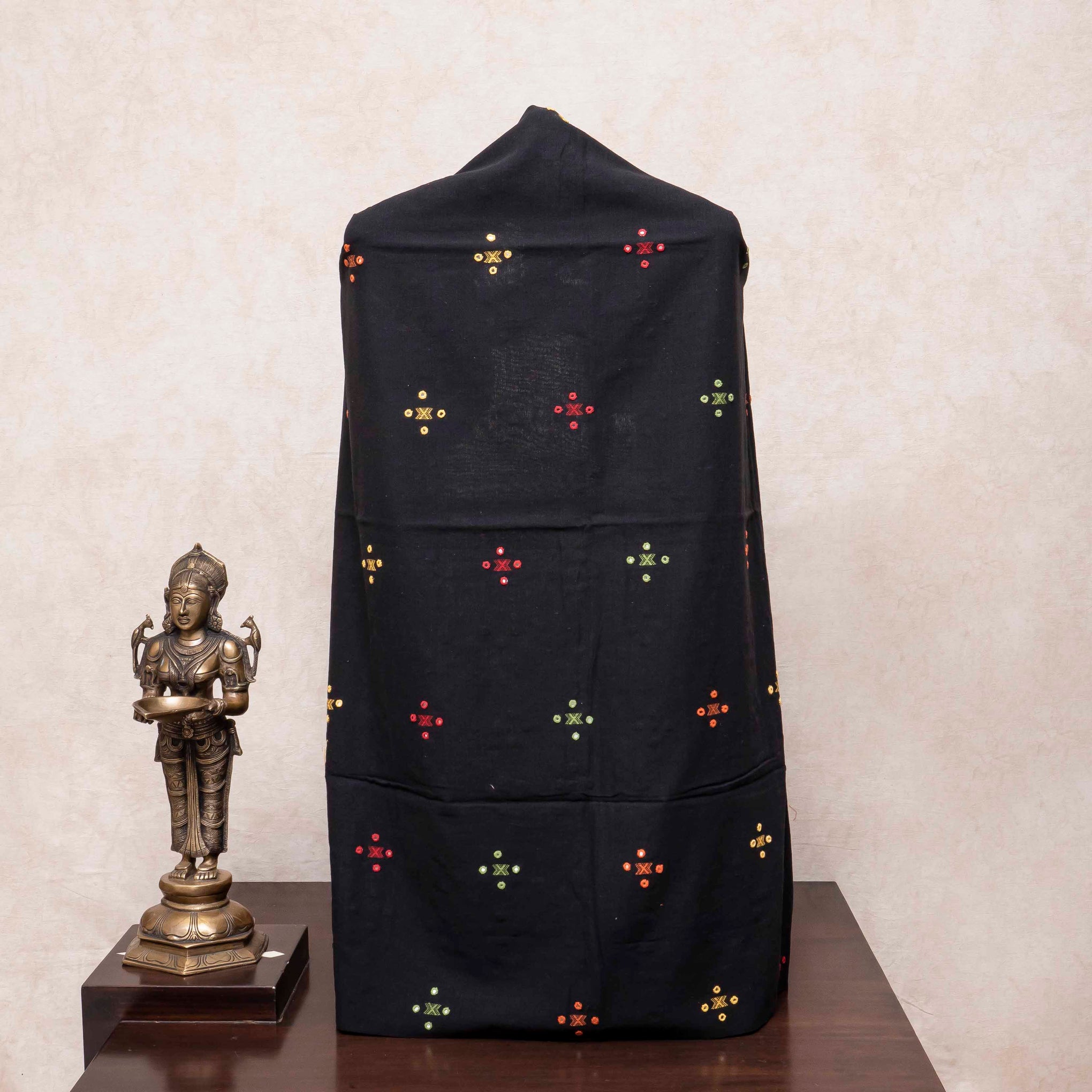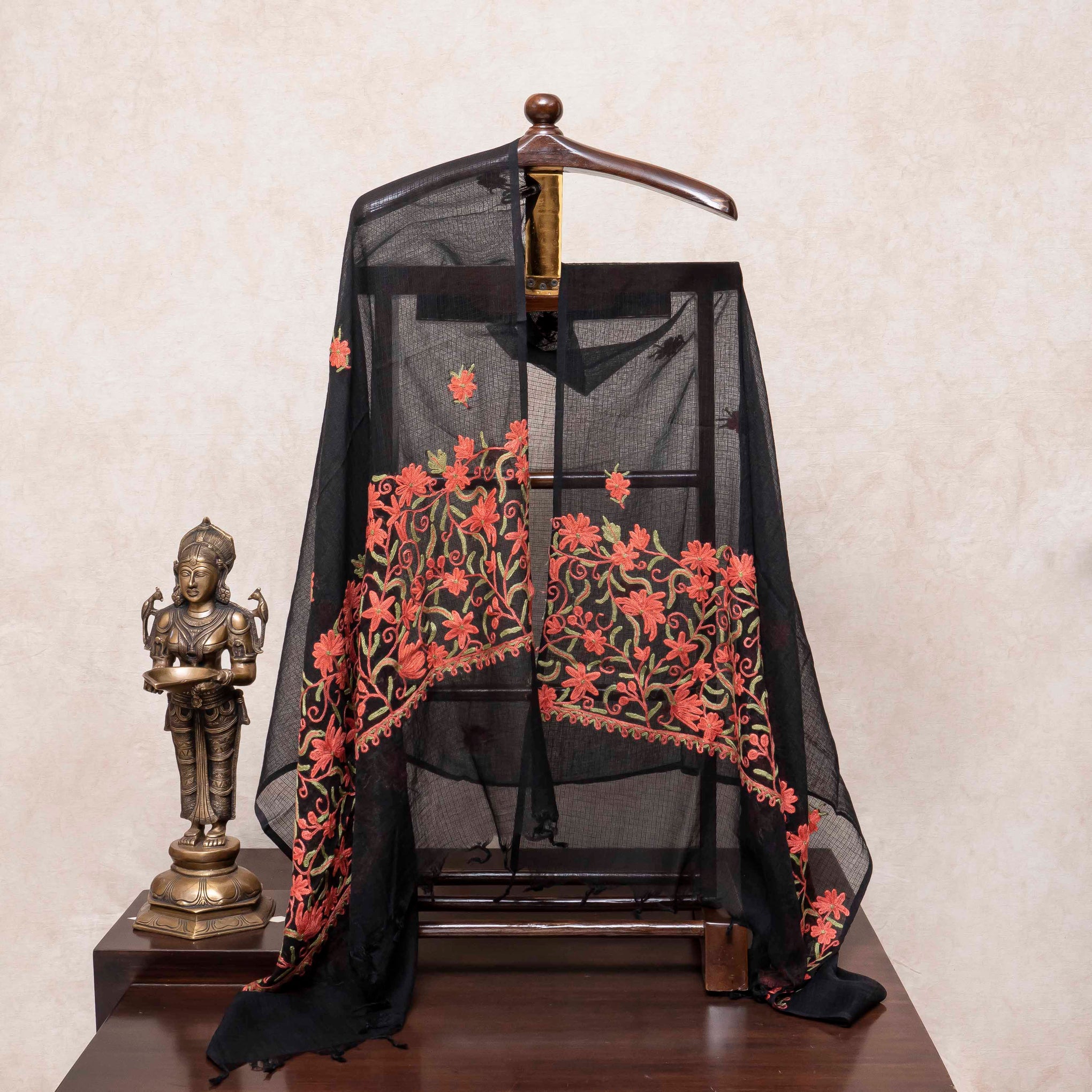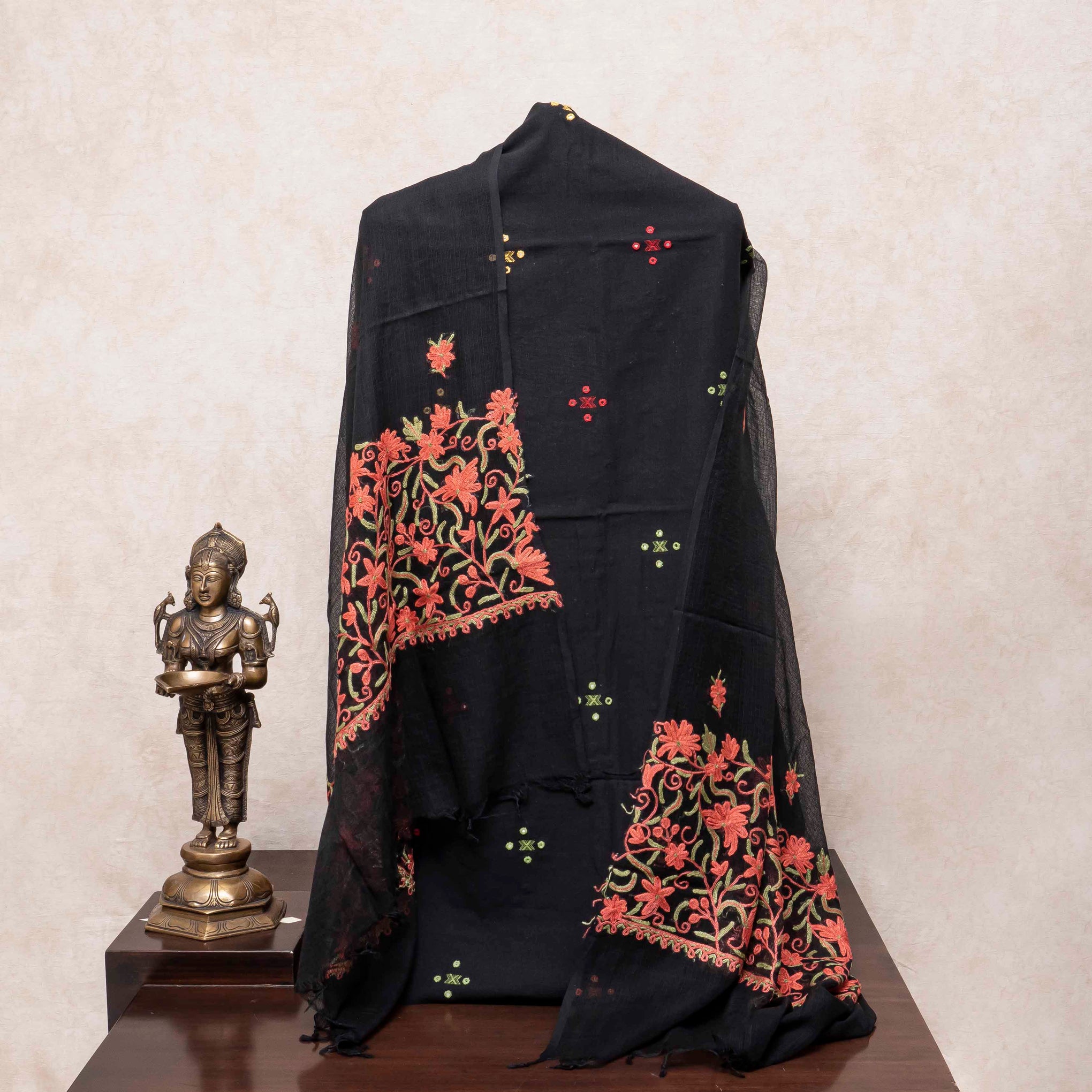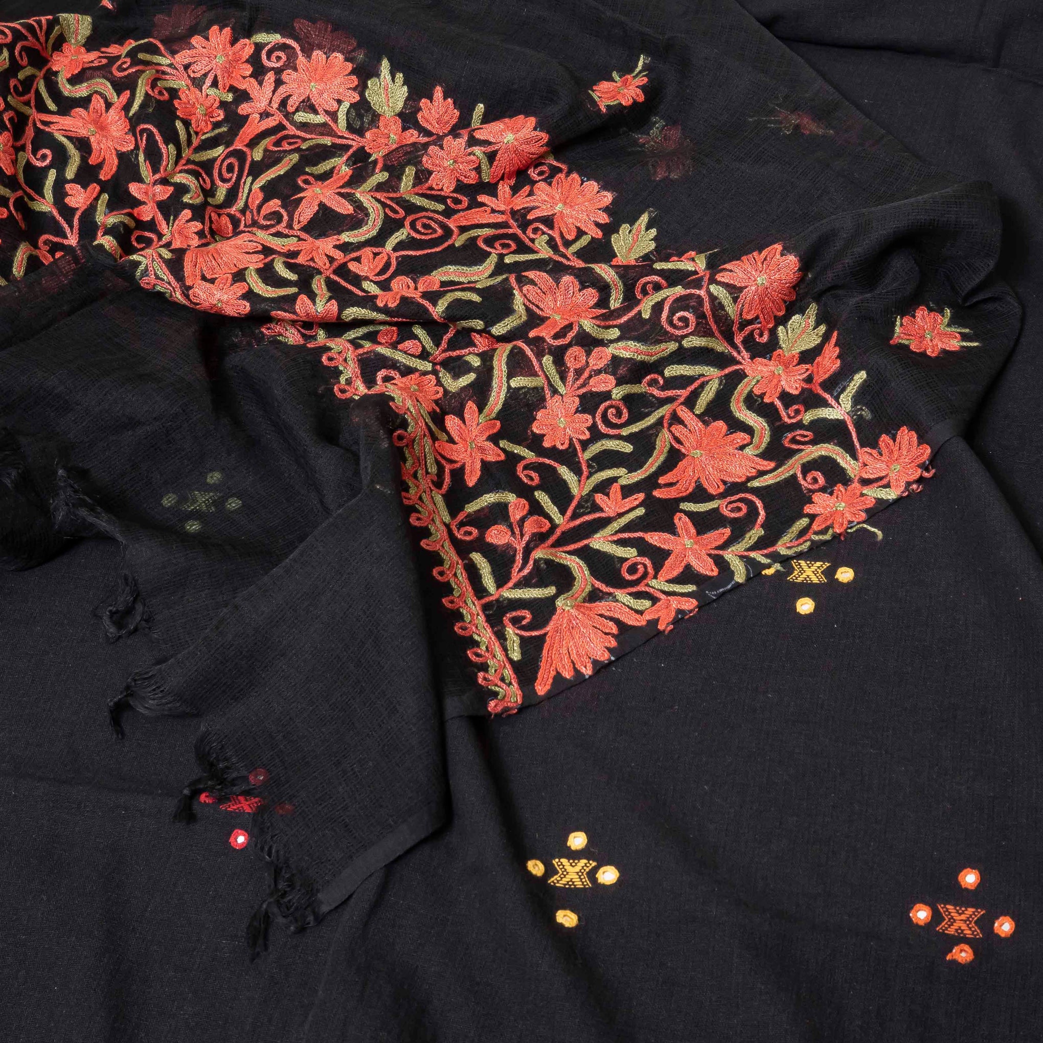 Color: A sophisticated base of Deep Black for the kurta, paired with a sheer Black Kota Doria dupatta that features bright, contrasting embroidery in Red, Orange, and Green.