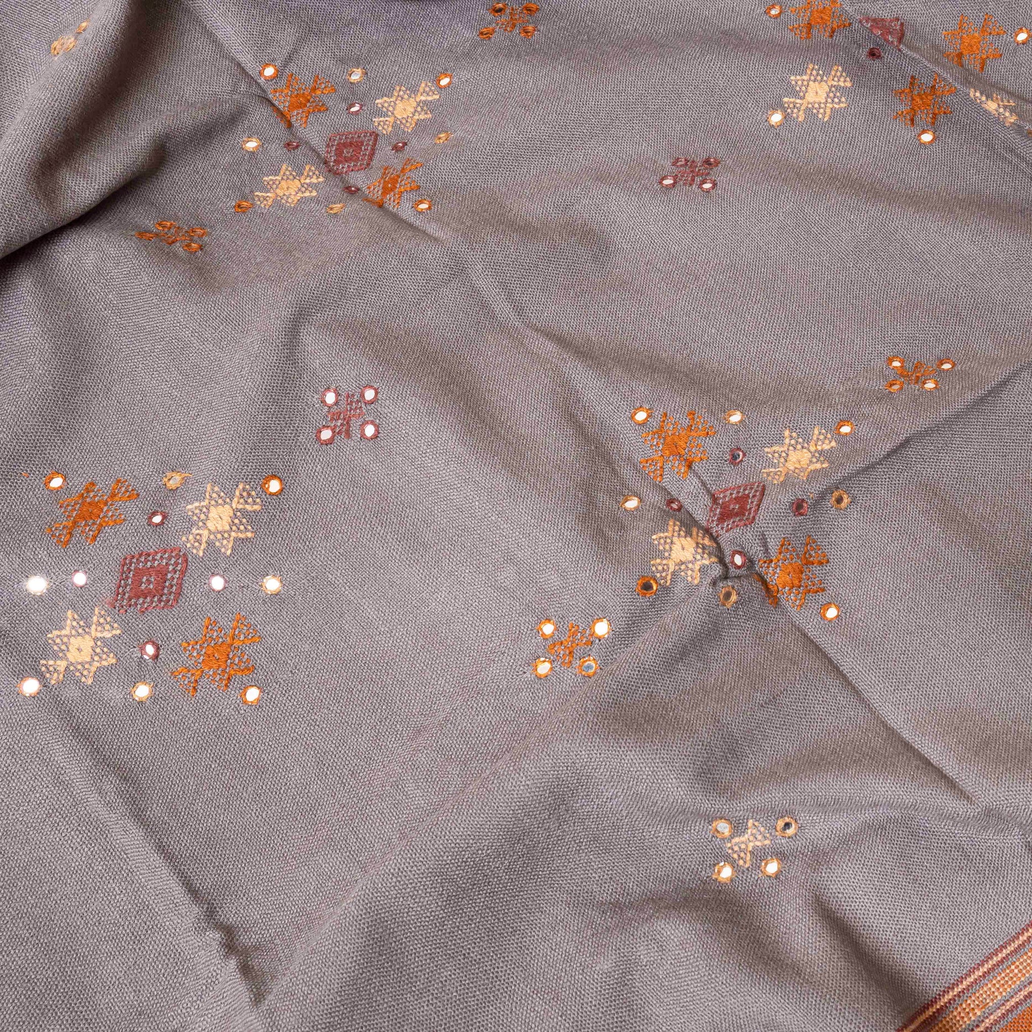 Color: A classic Heathered Grey base, with the embroidery featuring vibrant pops of Red, Orange and Beige threadwork, along with embedded mirrors.