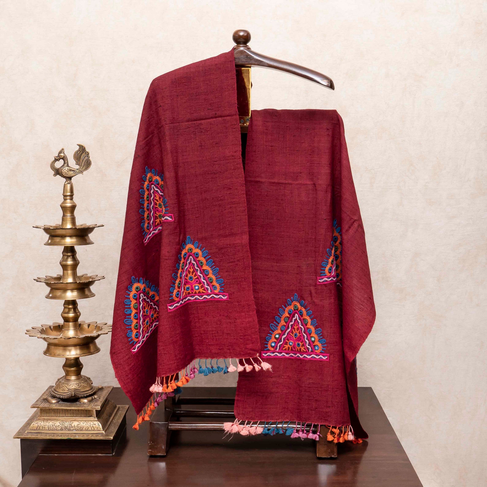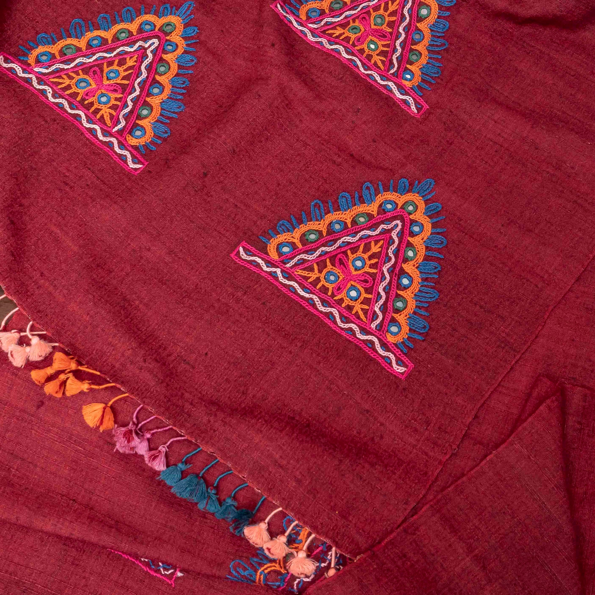 Design: Vibrant Rabari hand embroidery featuring layered geometric, triangular patterns, richly applied along the bottom edges, finished with contrasting colorful tassels.