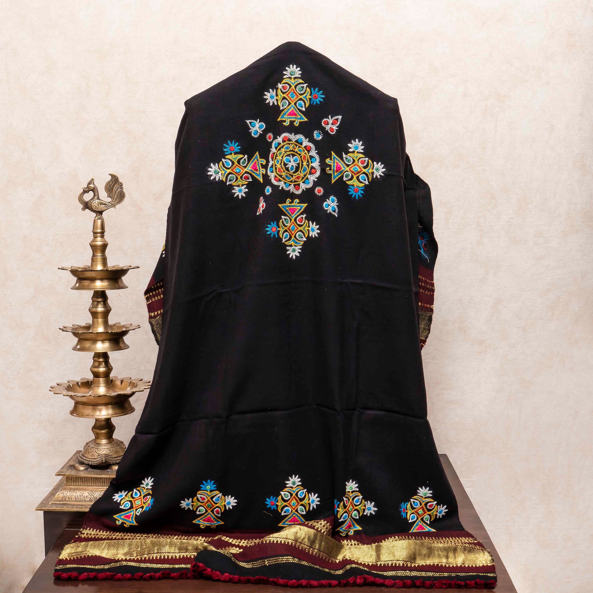 Color: Deep black base with multicolour embroidery, maroon accents, gold zari, and red tassels.