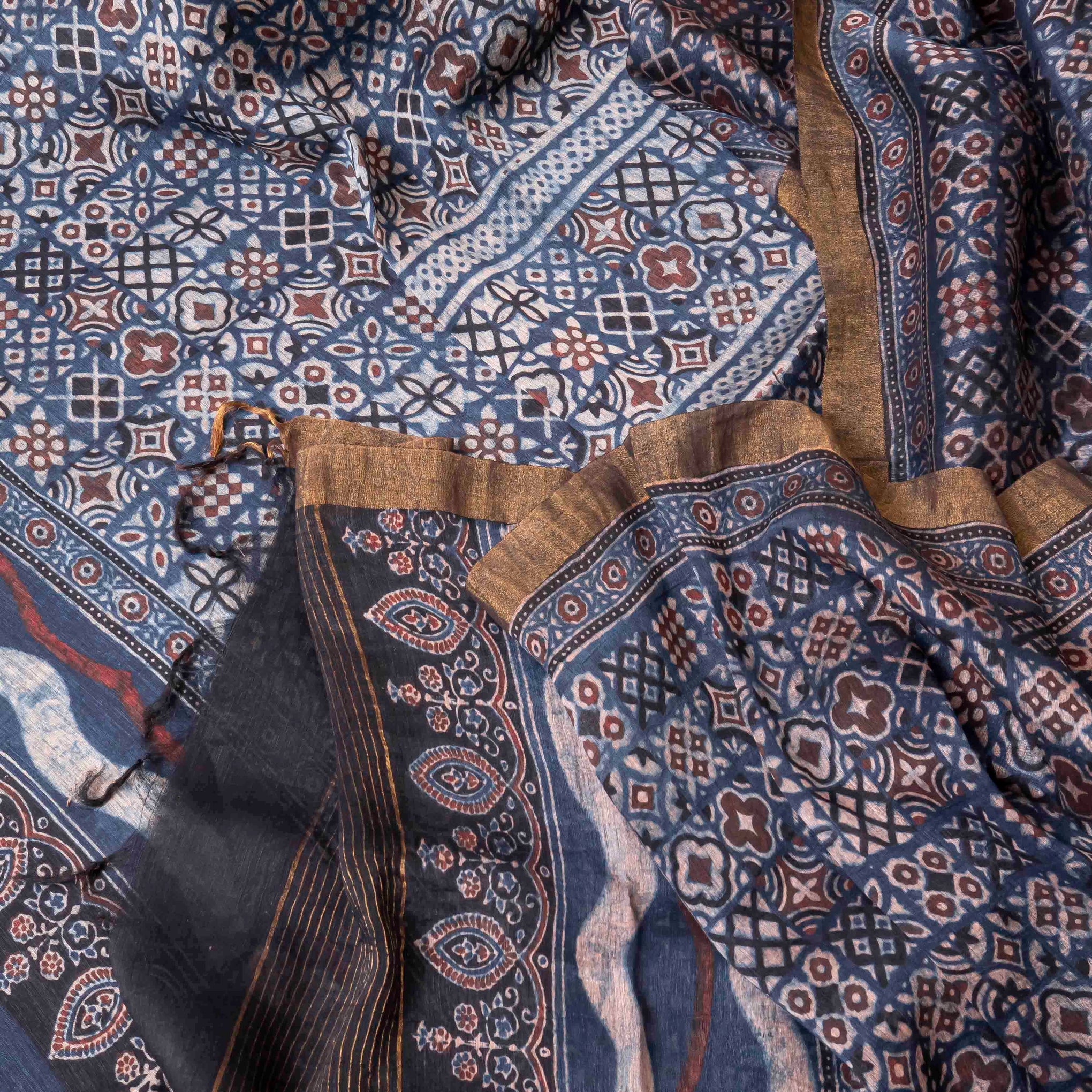 Design: Geometric and floral Ajrakh block patterns framed with a zari-inspired border.