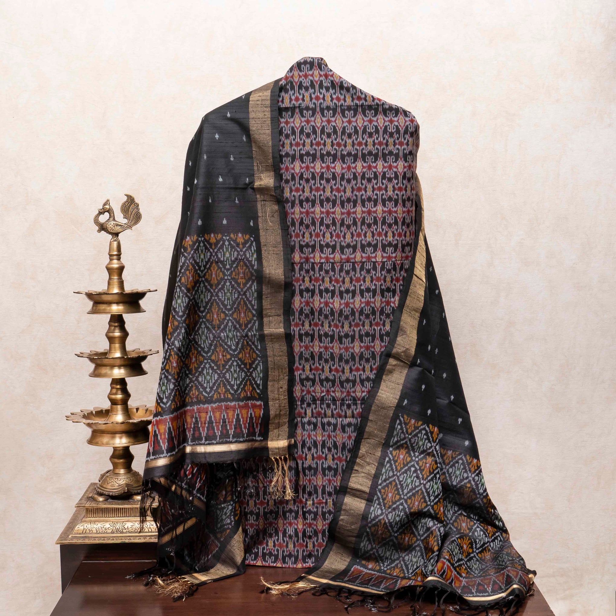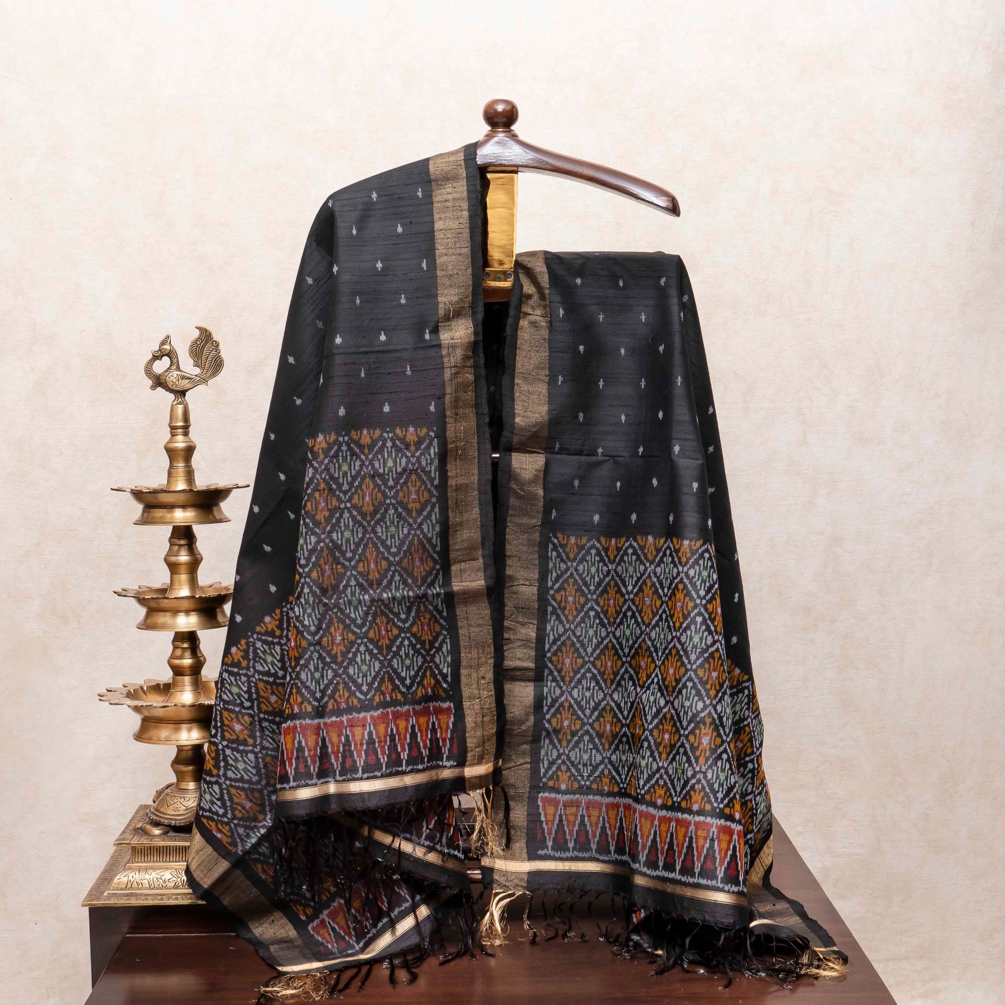 Color: A deep black base with traditional Pochampalli Ikkat patterns in red, white, and gold accents.