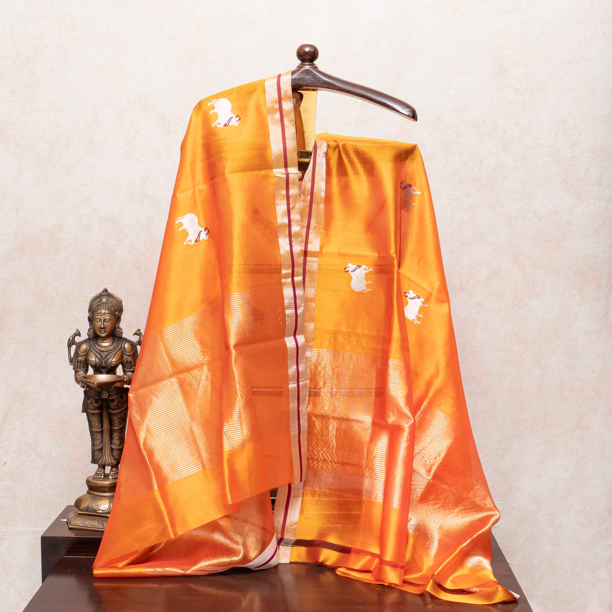 Design: Subtle, scattered silver motifs on the kurta are complemented by the detailed, traditional narrative imagery of the Pichwai design on the dupatta.