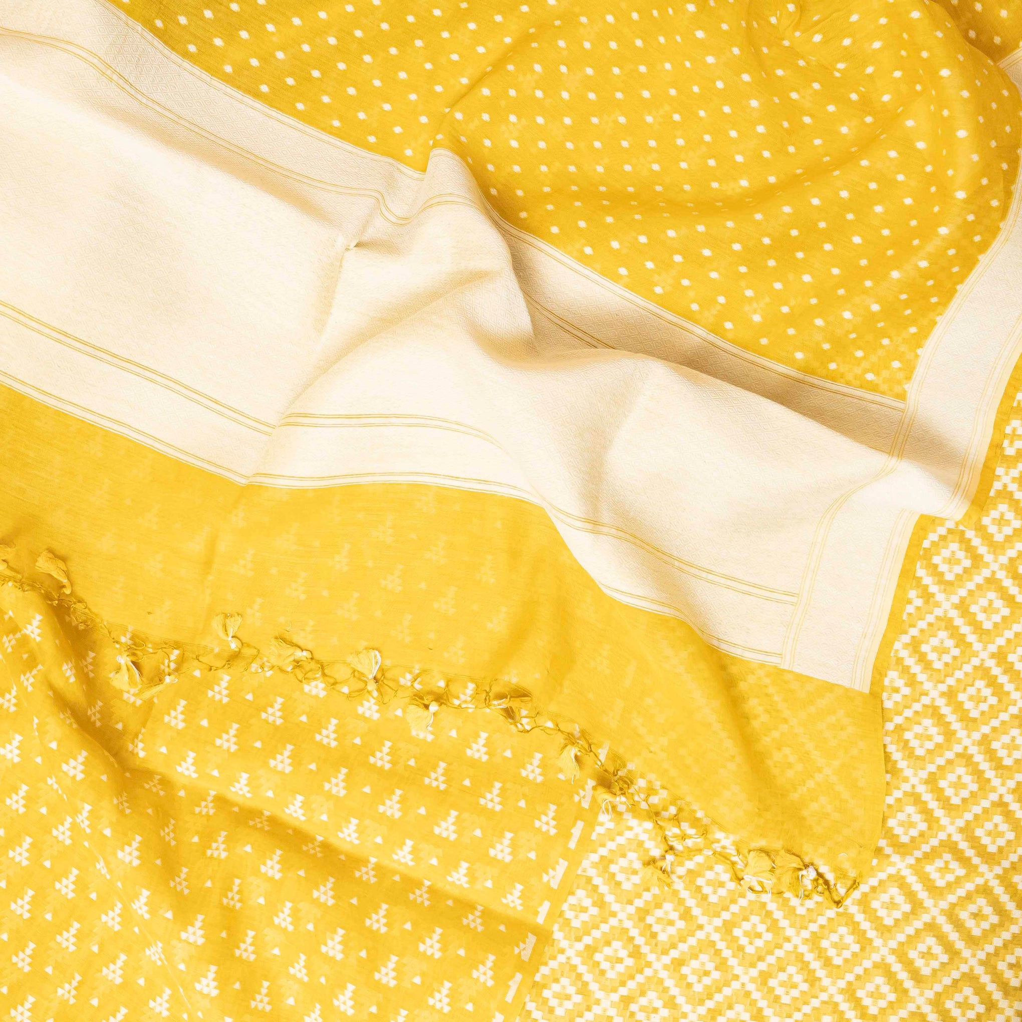 Color: A classic combination of an mustard yellow base with woven motifs in white.