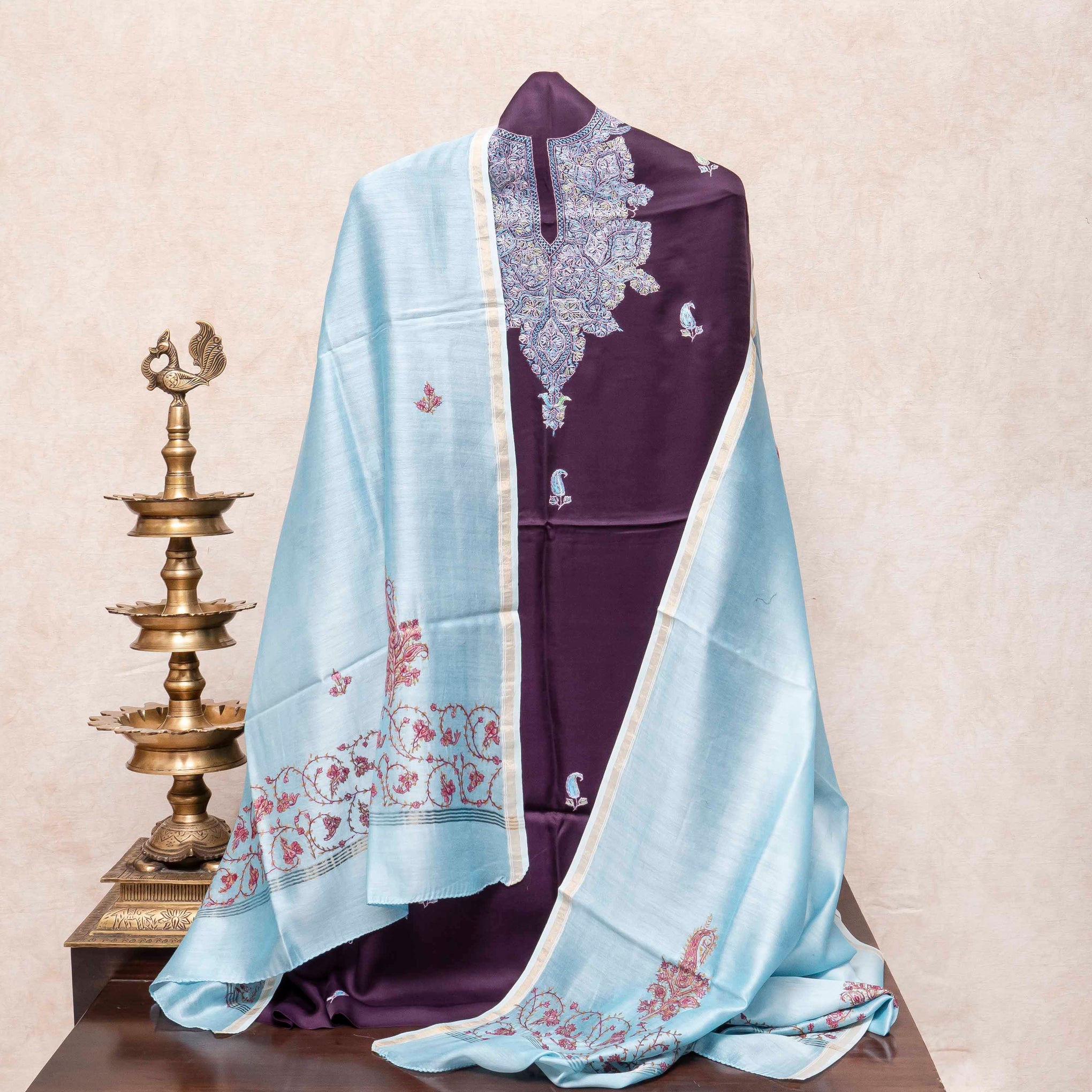 Color: A rich, deep base of Plum Violet for the kurta and bottom, beautifully contrasted by a luminous Sky Blue dupatta featuring light Red and Cream embroidery.