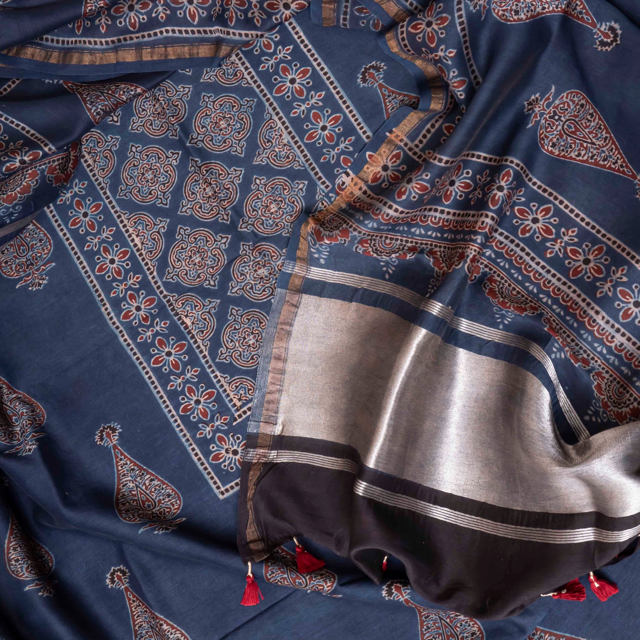 Design: Ajrakh block motifs with floral and geometric detailing, highlighted by zari borders and tassels.