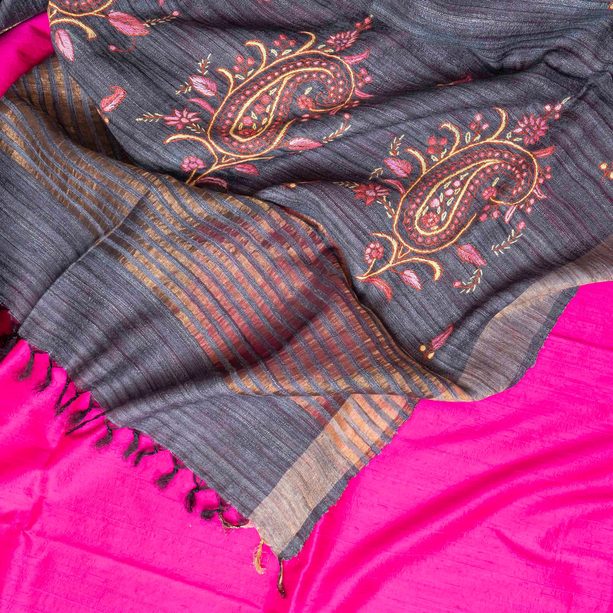 Color: A vibrant and bold base of Rani Pink (Hot Pink) for the kurta, paired with a sophisticated Slate Grey Tussar dupatta that features embroidery in Red, Gold, and Yellow threads.