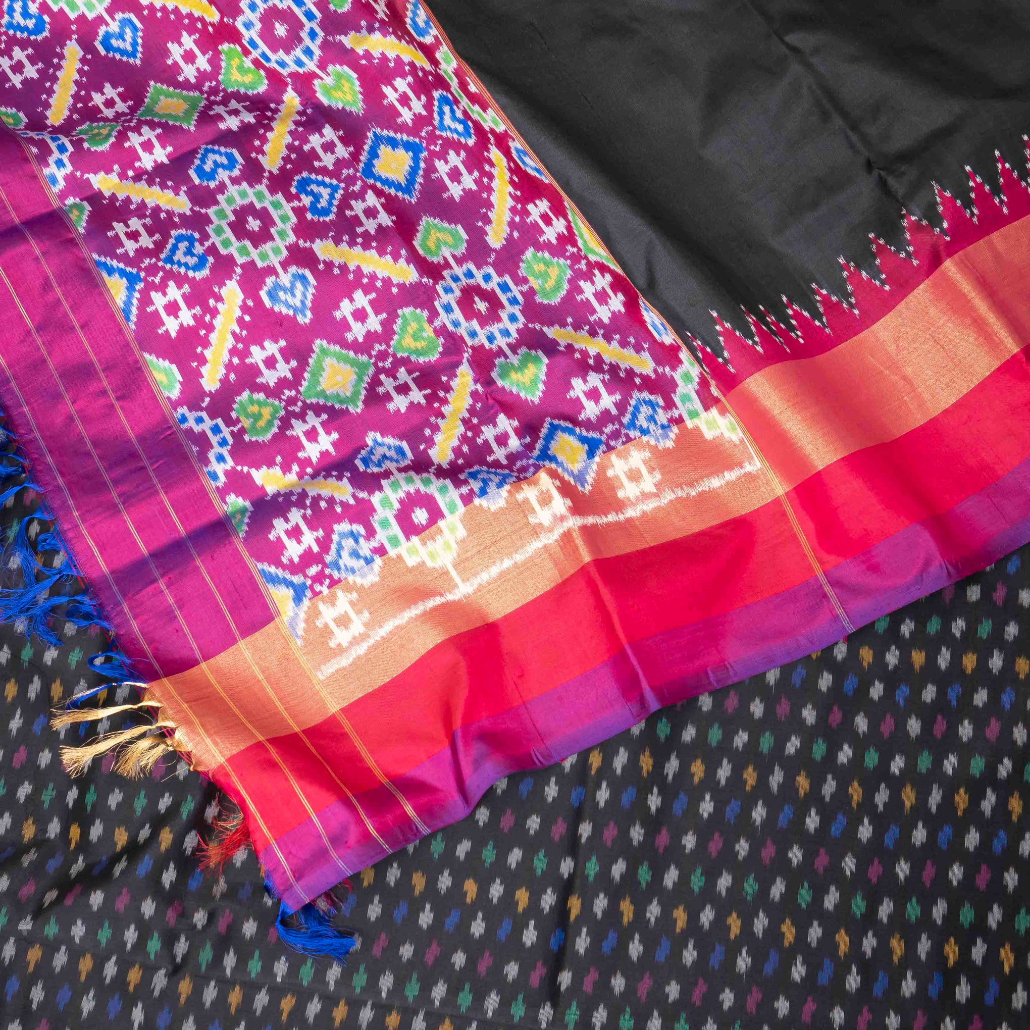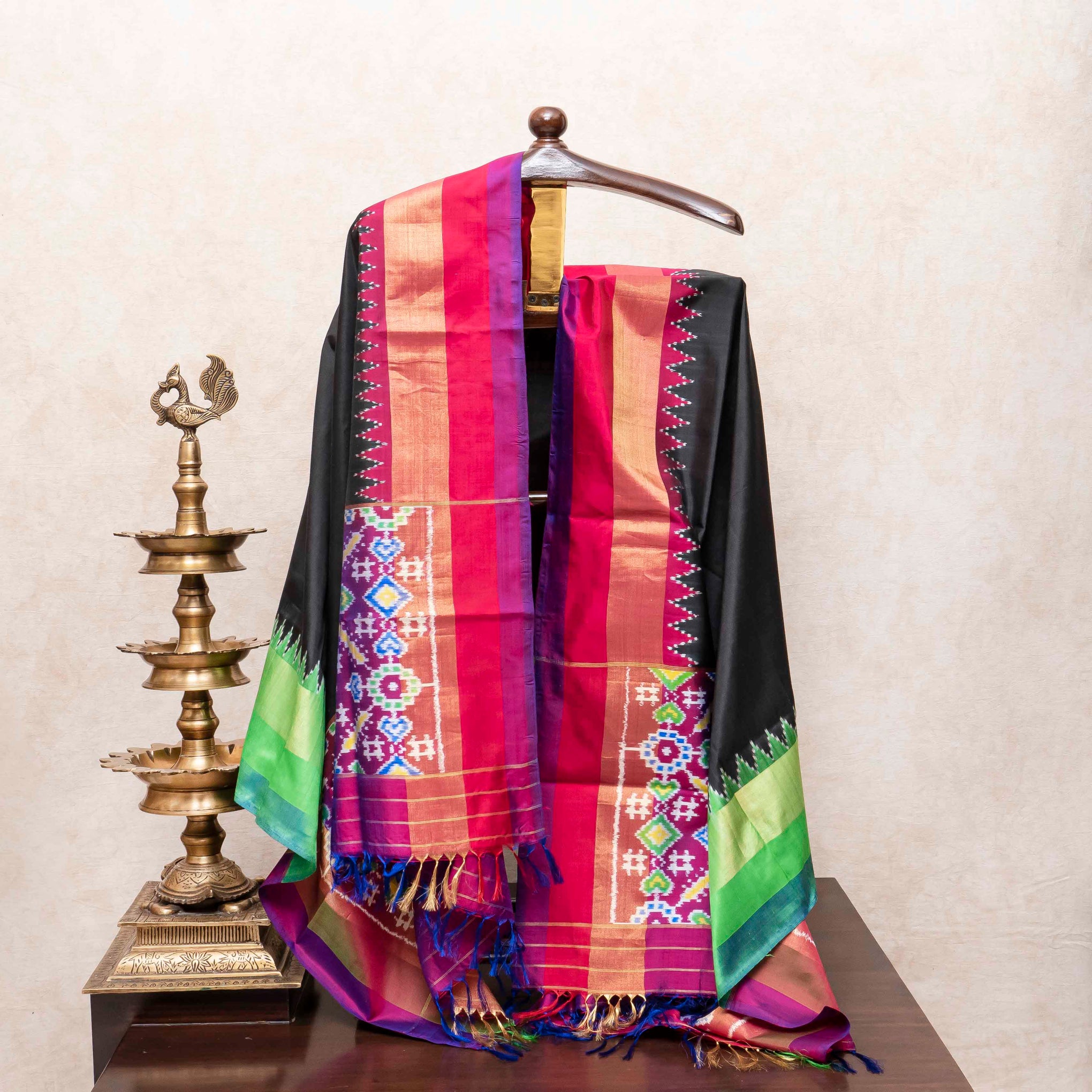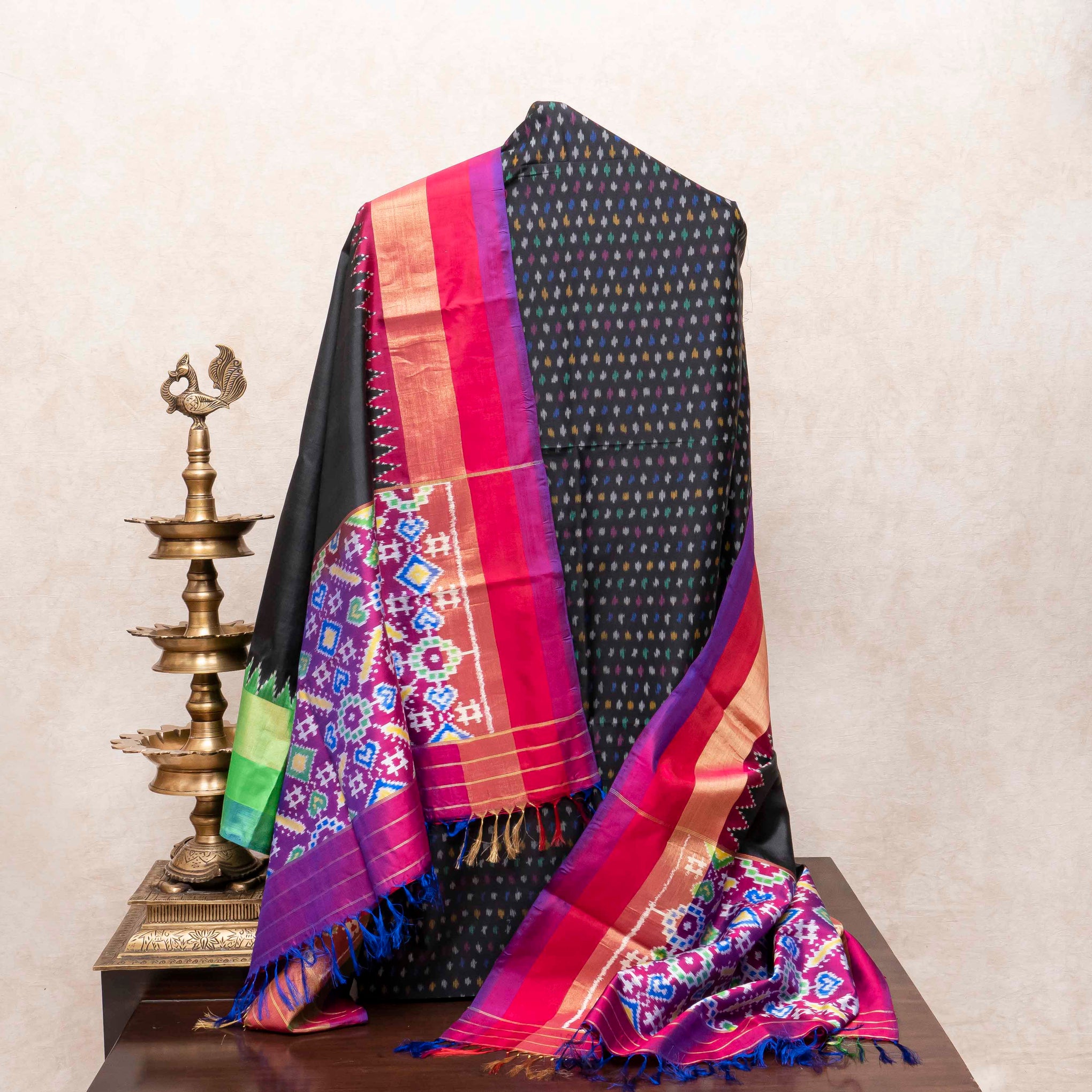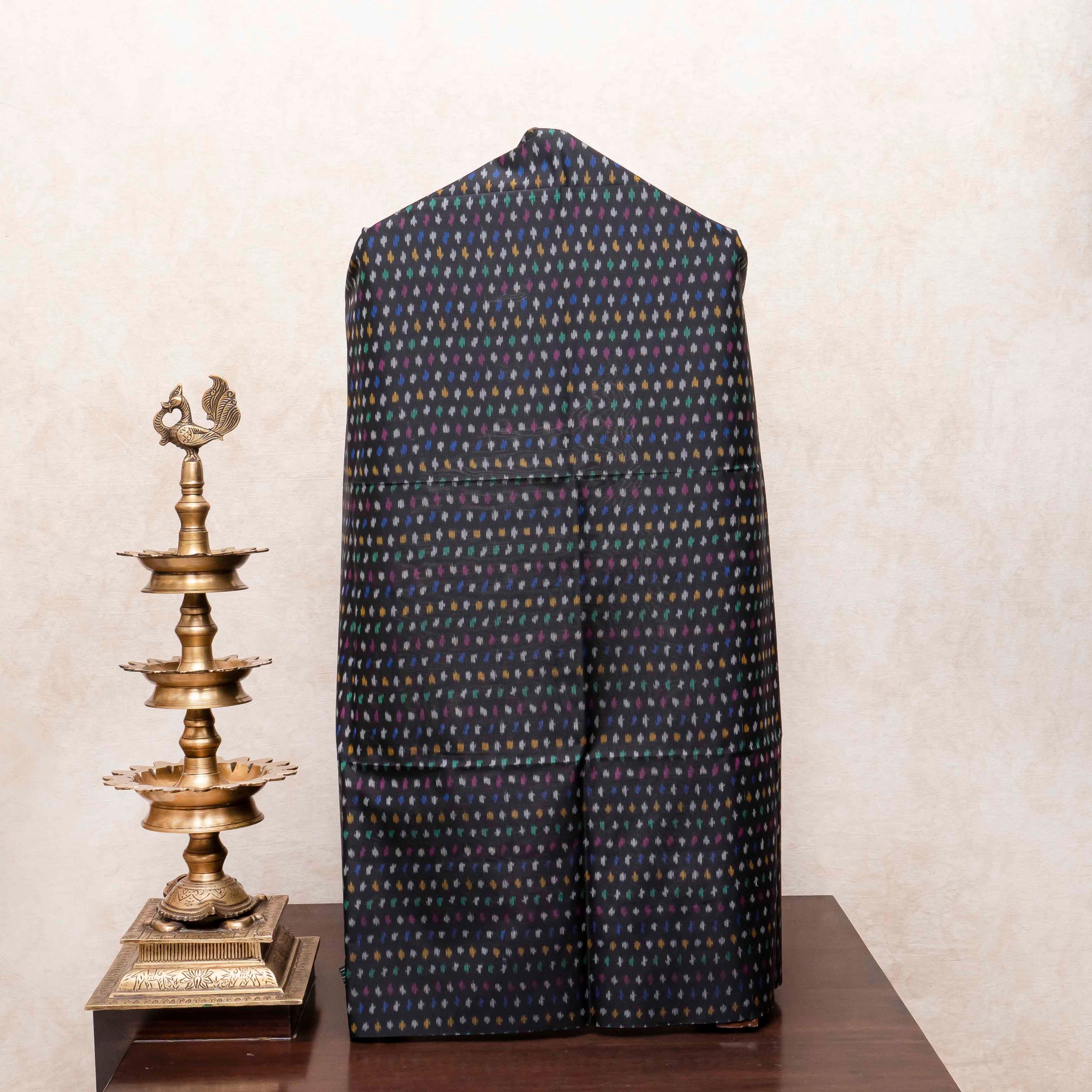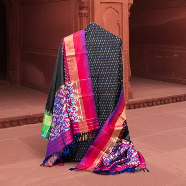 Product Details: This exquisite ensemble features a Handloom Ikkat raw silk kurta fabric, a generous 2.5-meter piece with a subtle sheen and rich texture. The set is beautifully paired with a Handloom Pochampalli Ikkat mulberry silk dupatta, which showcases a stunning blend of patterns and a classic Zari border. This combination offers a unique contrast of serene black with vibrant colors, perfect for a sophisticated look.
