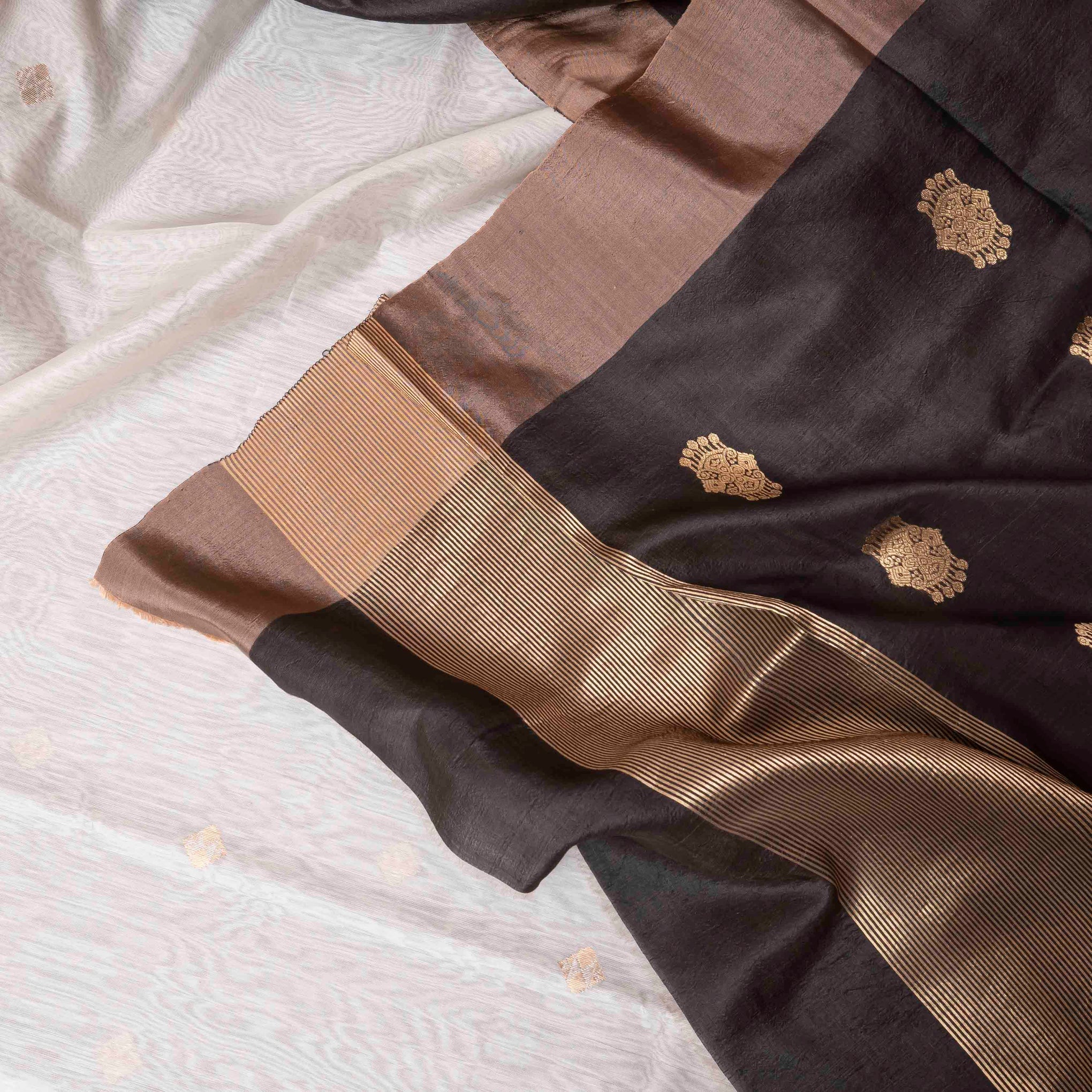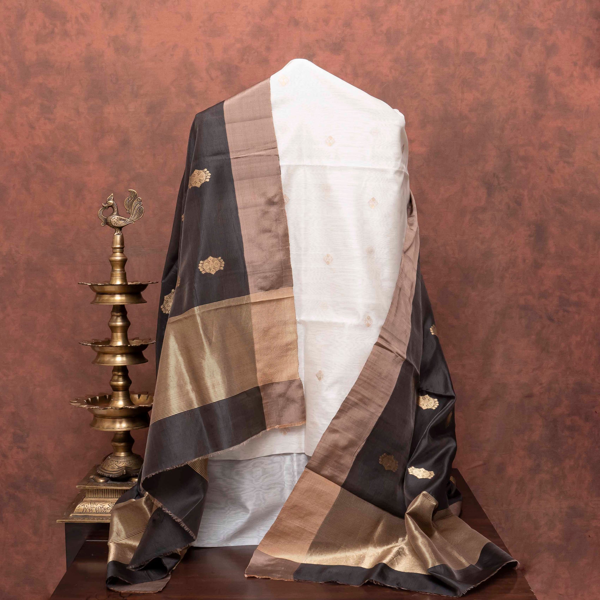 Color: Ivory-white kurta and bottom with golden kadwa motifs, paired with a black and gold Pattu dupatta.