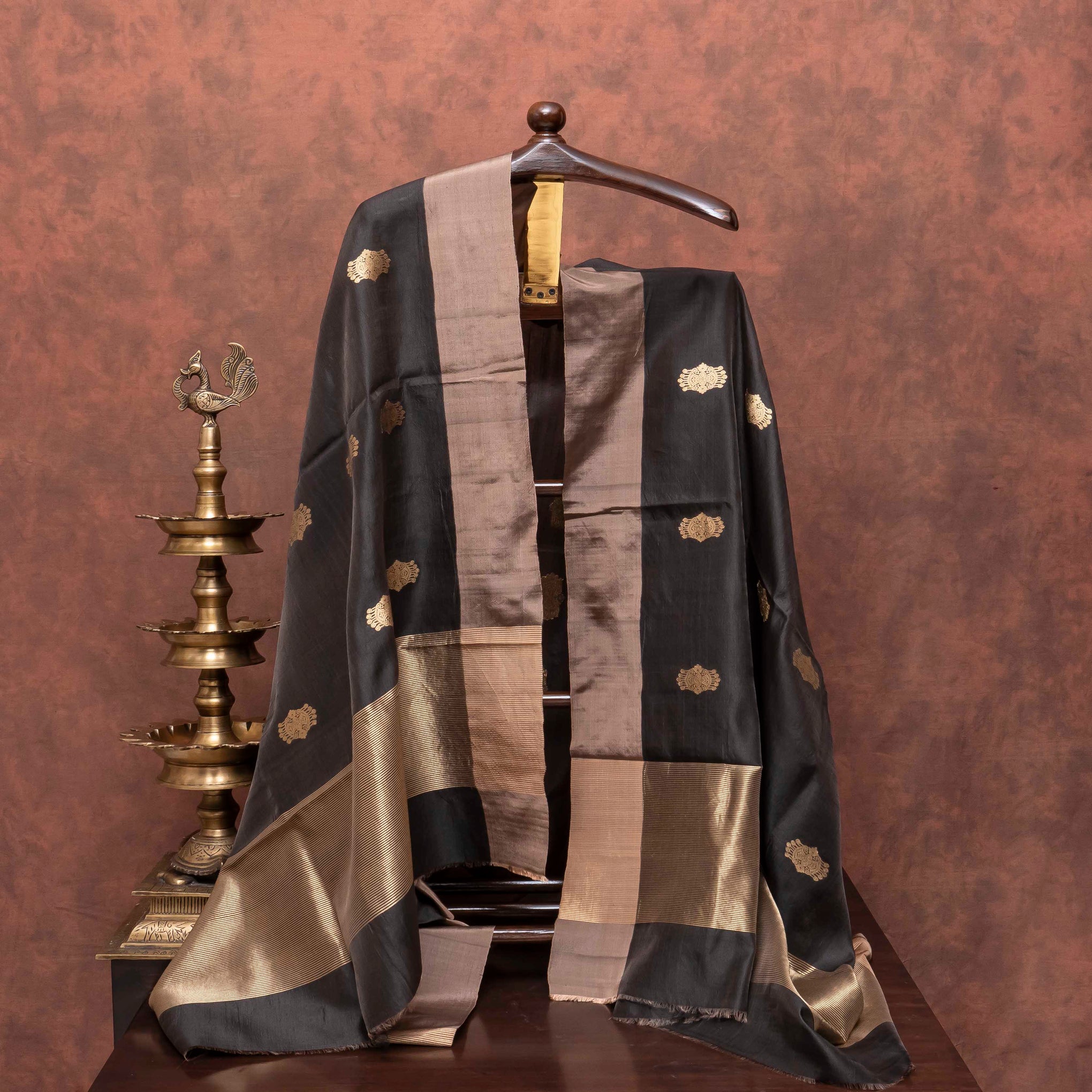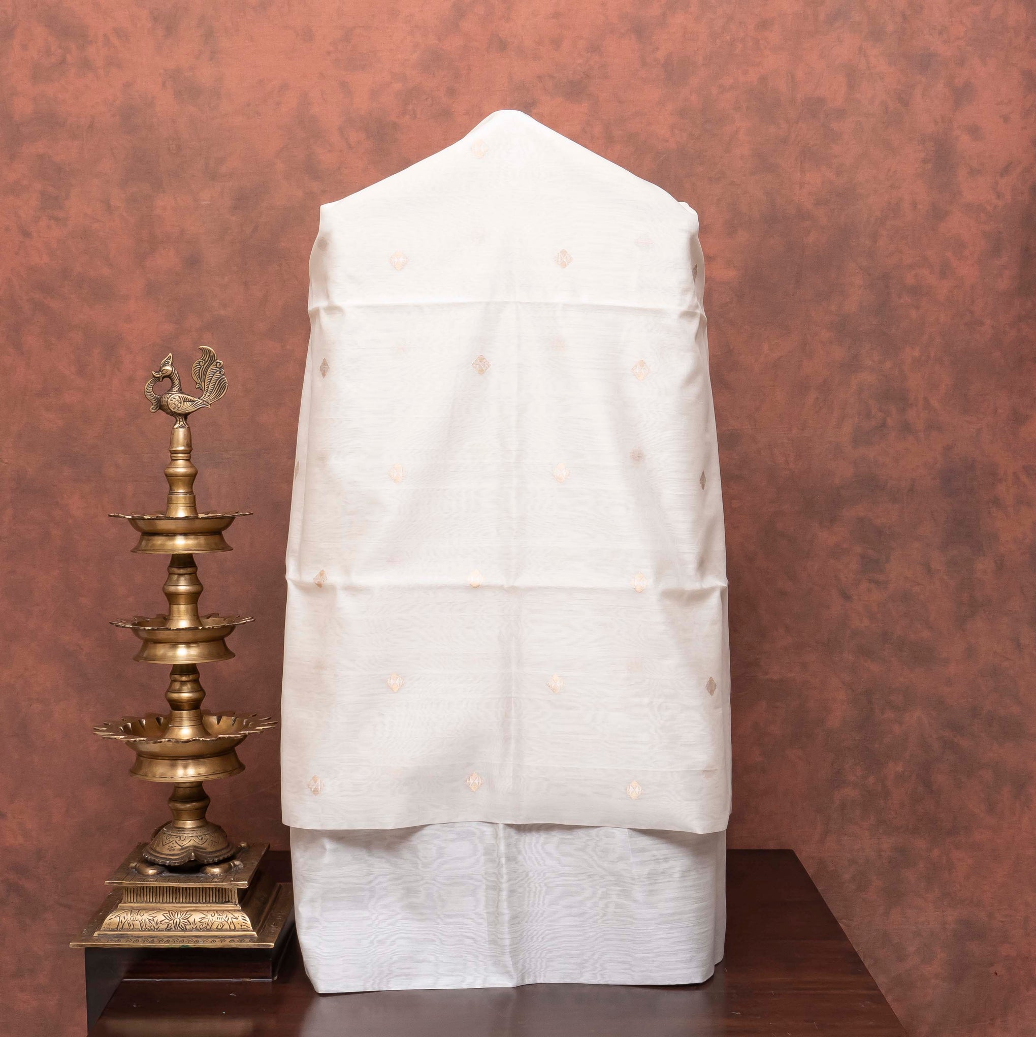 Design: Kadwa woven motifs on Chanderi silk fabric paired with bold golden bootas on rich Pattu dupatta.