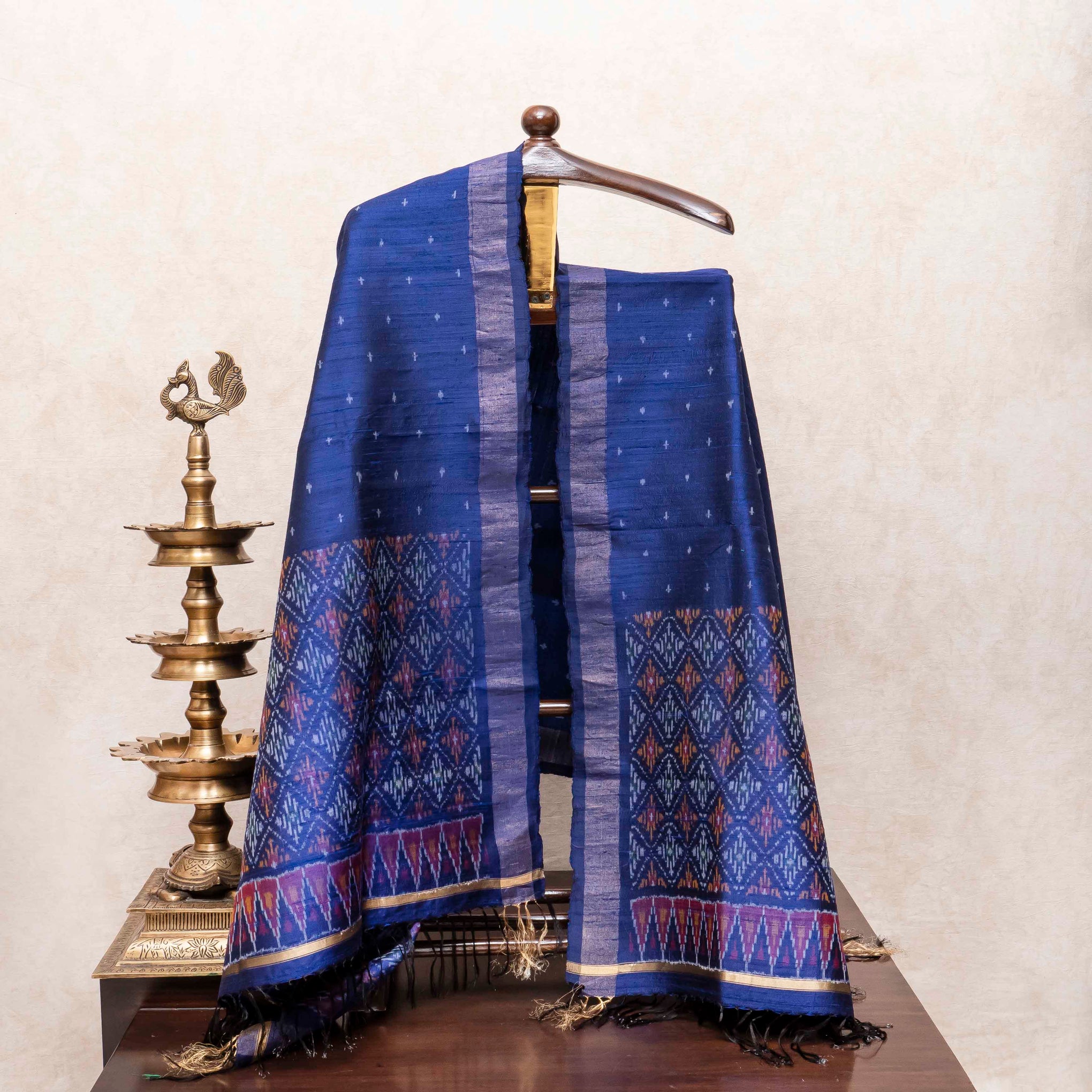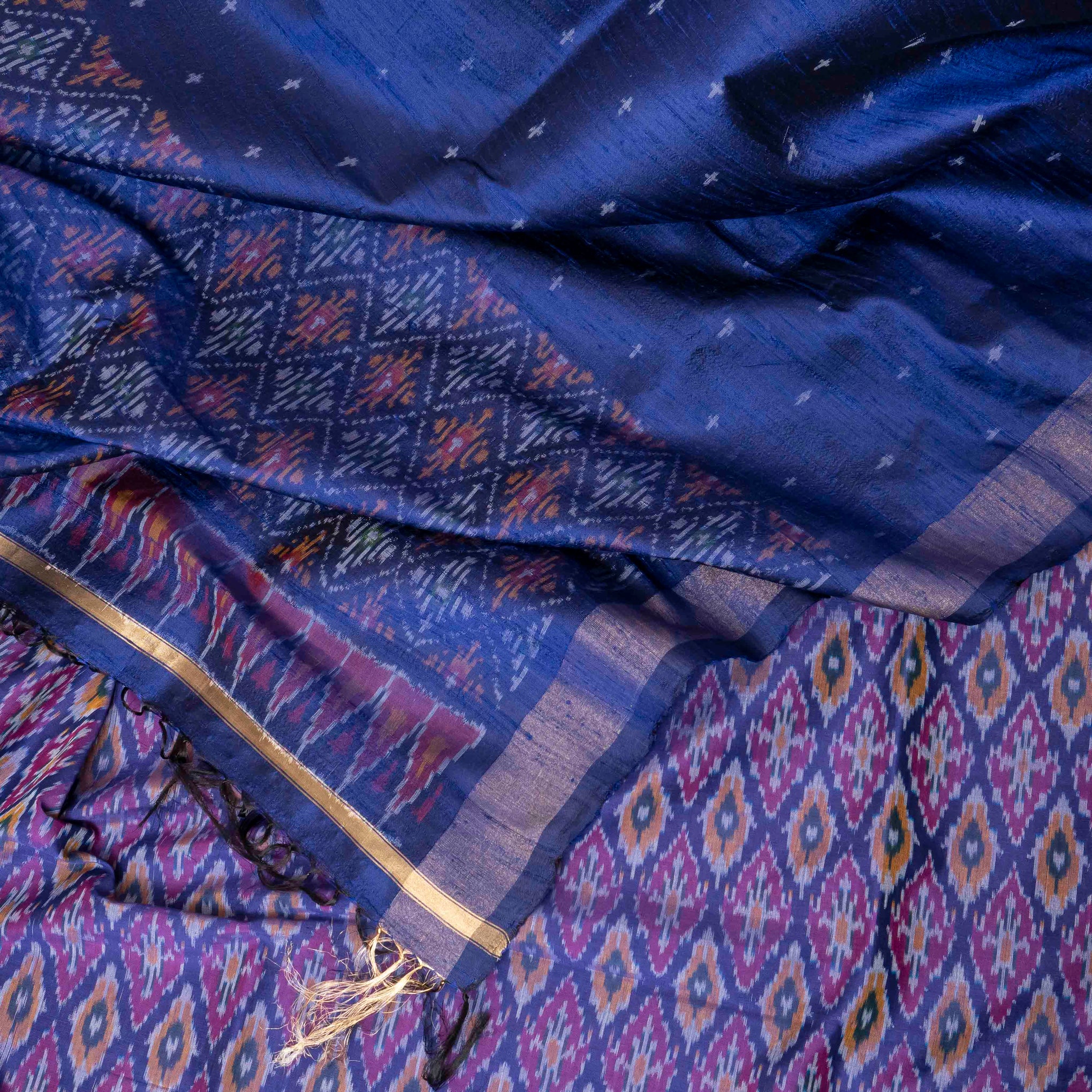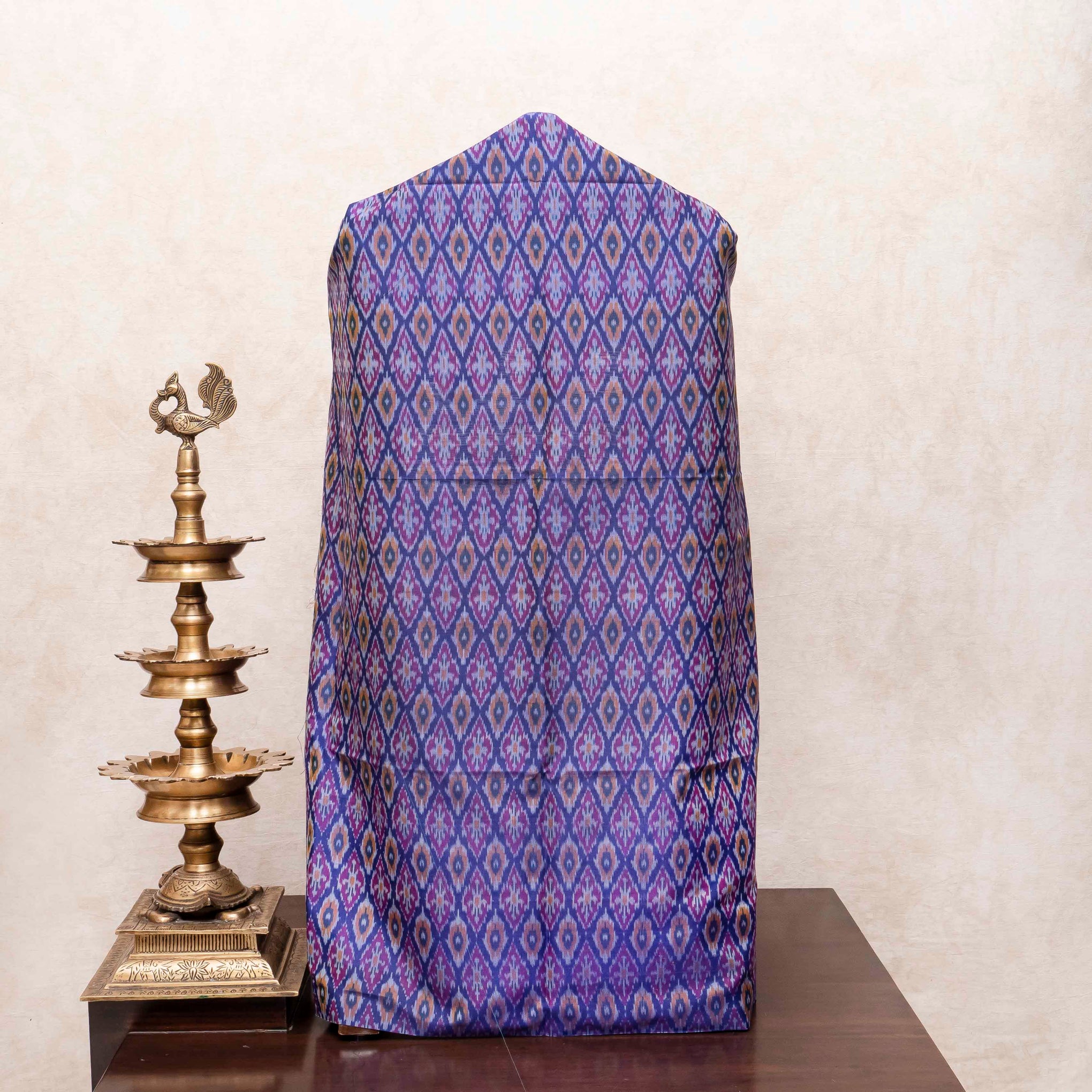 Color: A deep royal blue base is accented with traditional Ikkat patterns in shades of purple, yellow, and gold.