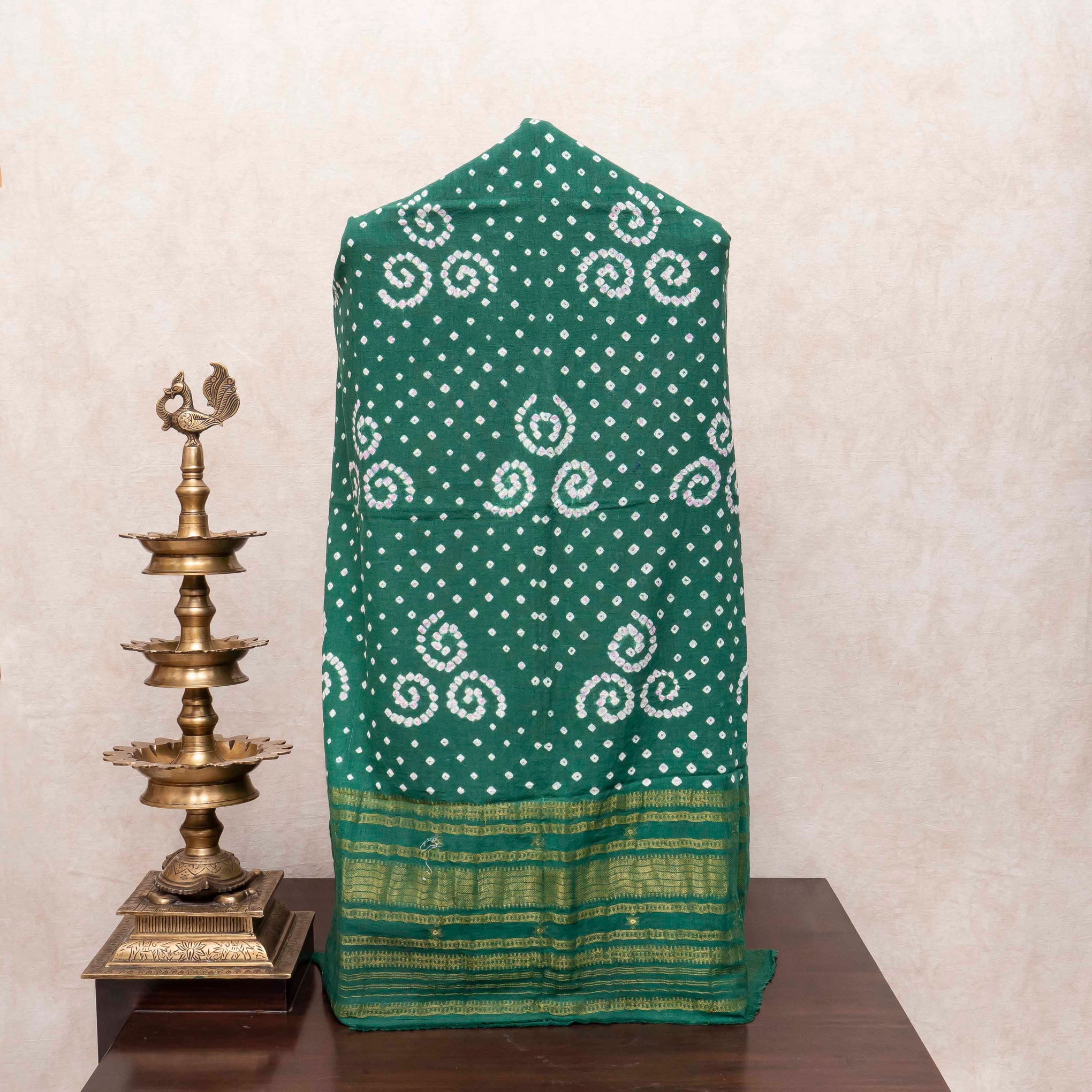 Color: Emerald green base with white Bandhani dots and golden striped accents.