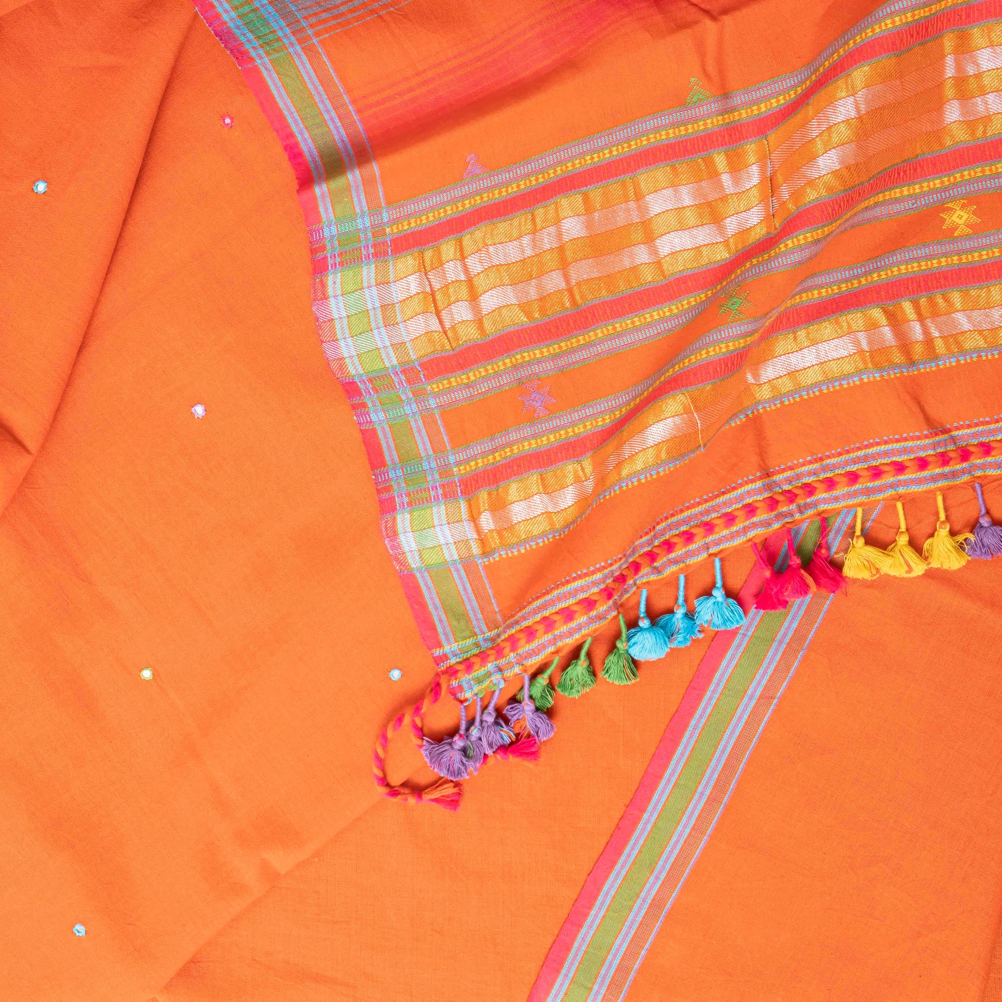 Product Details: This vibrant three-piece ensemble is meticulously hand-woven from organic Kala cotton, celebrating the sustainable textile heritage of Gujarat. The kurta fabric is adorned with delicate multi-colored micro-embroidery that adds a playful yet sophisticated texture to the bright base. The accompanying dupatta features a striking interplay of horizontal zari stripes and rainbow-hued borders, finished with whimsical handcrafted tassels. Offering a perfect blend of rustic handloom charm and modern festive flair, this set ensures breathable comfort without compromising on style.