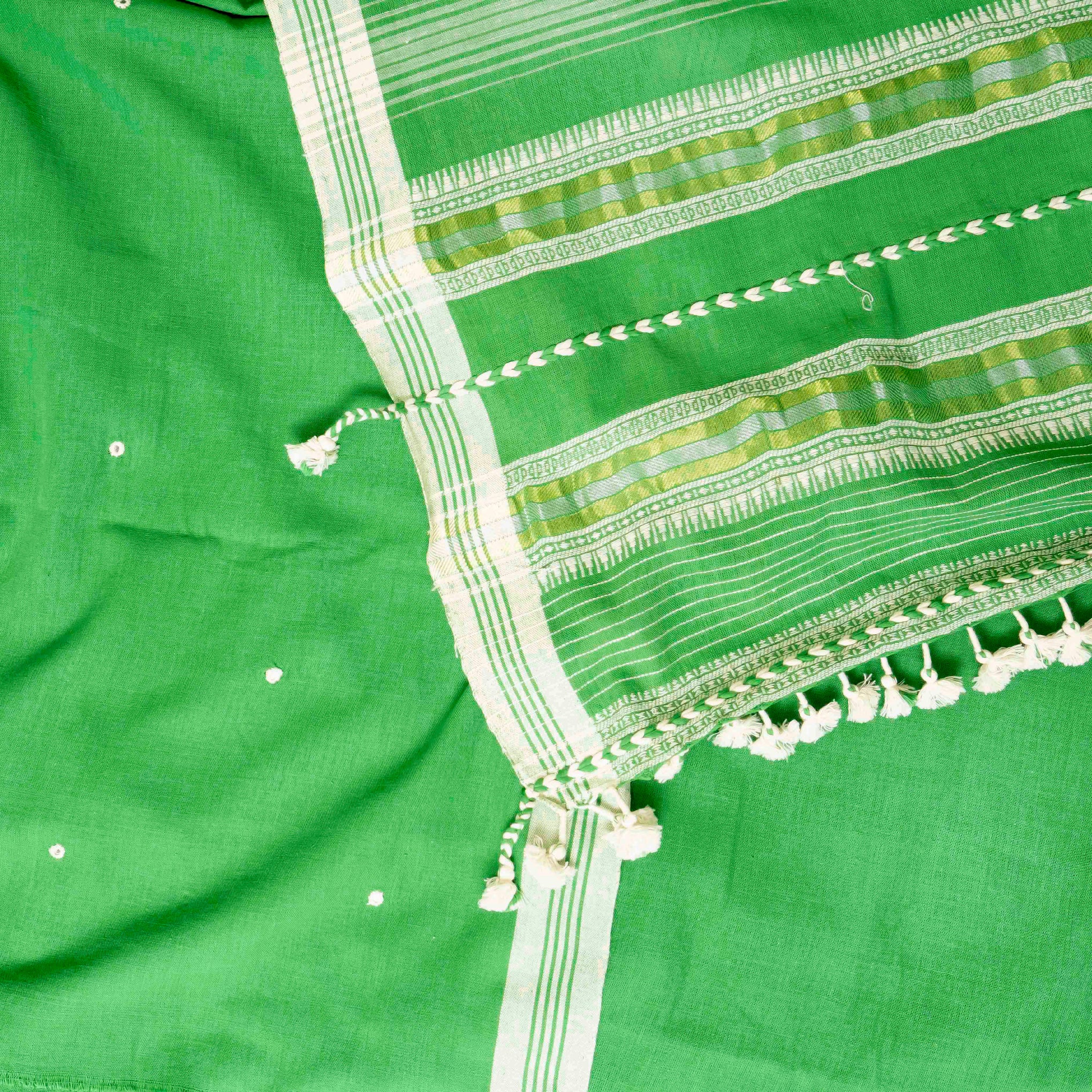 Product Details: This vibrant three-piece ensemble is meticulously hand-woven from organic Kala cotton, celebrating the sustainable textile heritage of Gujarat. The kurta fabric is adorned with delicate white micro-butis that add a playful yet sophisticated texture to the bright green base. The accompanying dupatta features a striking interplay of horizontal white stripes and traditional geometric patterns, finished with handcrafted tassels. Offering a perfect blend of rustic handloom charm and modern flair, this set ensures breathable comfort without compromising on artisanal style.