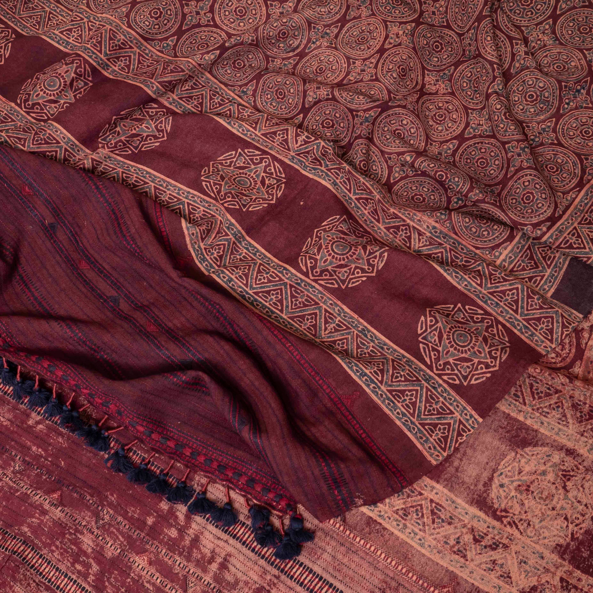 Color: Deep maroon base highlighted with beige Ajrakh prints and dark indigo tassel accents.